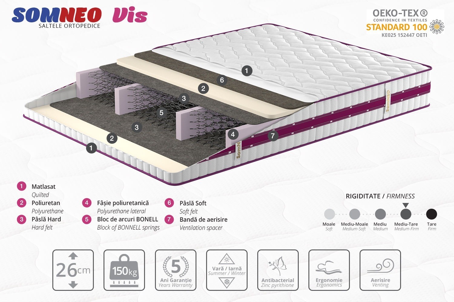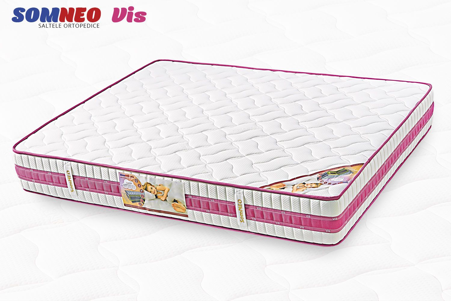 Salteaua VIS este dotată cu un strat de confort sporit de pasla Soft, care asigură poziţia corectă a corpului şi oferă un somn confortabil, sănătos şi relaxant. Are două feţe, una pentru anotimpul rece, care menţine bine căldura, şi cealaltă pentru anotimpul cald, care oferă o circulaţie a aerului mai mare. Ventilarea sporită are loc prin intermediul unei benzi de aerisire plasată pe laterala saltelei. Suprafaţa exterioară a matlasatului, fiind acoperită cu stofa de tip Knitted, este elastică, iar datorită acestui aspect, îşi menţine forma iniţială mai bine în timp